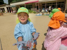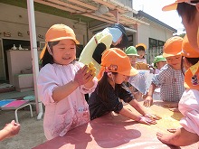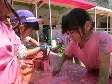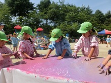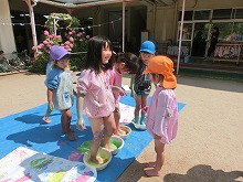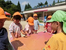今日もとっても暑い日になりました。園庭では、絵の具で遊ぶコーナーが色々あり、子ども達は思い思いの場所で楽しく遊びました。「絵描いたよ。見て!」「つるつるしてる」「手見て!」と、筆、手足を使って思う存分遊び、最後はシャワー遊びをしてすっきり!!絵の具を使って、自分なりの表現をしたり夏ならではの開放感を楽しんだりすることができました。