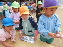 楽しみにしていた焼き芋大会!先日掘ったサツマイモを4,5歳児の子どもたちが丁寧に洗い、アルミホイルを巻いてくれました。
