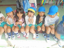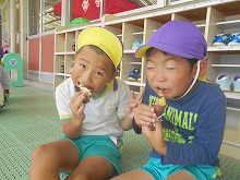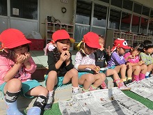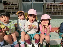 テラスに座ってアツアツの焼き芋を食べる子どもたち。「あまーい」「ホカホカやな」「おかわりほしいな」と、自分たちで育て、掘ったお芋の味は格別でした。
