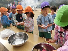 園庭の真ん中のたき火を見ながら、「おいしくなーれ」「もうできた?」「先生!焼くの頑張ってね」と、楽しみにしばらく遊んでいると、いいにおいがしてきて焼き芋ができあがりました。