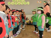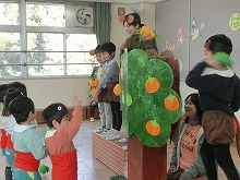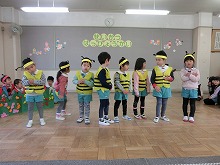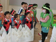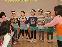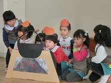 今日は4歳児の子どもたちが、劇の役を交代して遊びました。何度も見せ合いっこをしていた子ども達は、自分の役以外のセリフも踊りもばっちりでした!先生も一緒に役になって楽しい劇遊びになりました。