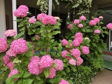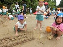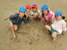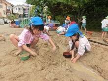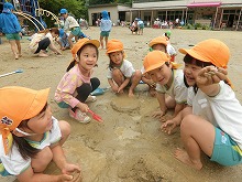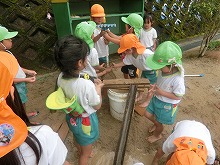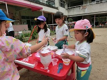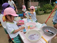 職員室前のピンクのアジサイが、色鮮やかにたくさん咲いています。子ども達は、雨上がりの園庭でどろんこ遊びや泡遊びを楽しみました。「バナナジュースできたよ」と、泡だて器を上手に使って遊んでいる子。「1,2,3・・・もう13個できた!」と泥団子を並べて遊んでいる子。「滑り台するからここもってて」と樋に水を流して遊んでいる子など、それぞれ自分のしたい遊びを見つけて楽しんでいます。泥や泡を触って開放的な気分になり、笑顔がいっぱいでした。