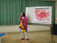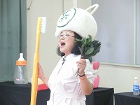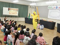 今日は、歯の指導がありました。ピカチュウが登場すると、「わぁ」と歓声があがり大喜びの子どもたち。歯にいいおやつについてや、どうして歯磨きが大切なのかを、楽しく教えていただきました。講師の先生の歌って踊っての楽しい話に、子どもたちは引き込まれ、集中して話を聞くことができました。
