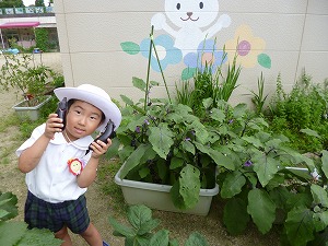 ピーマン、なすびなど日に日に大きくなる野菜の収穫を楽しみにしている子ども達です。