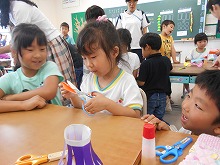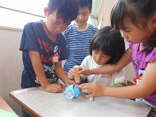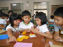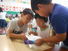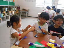 今日は5歳児が、薪小学校の1年生のクラスに行き、一緒に七夕飾りをつくりました。教室の席に座らせてもらい、小学生のように授業を受けているような感じに、ドキドキワクワクの5歳児でした。最初に七夕の歌を一緒に歌い、「その歌幼稚園でも歌ってるよ」と、和やかな雰囲気でした。1年生は「ここ切ってね」「やり方わかる?」と、優しく声をかけながら飾りの作り方を教えてくれたので、楽しく取り組むことができました。