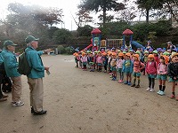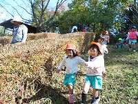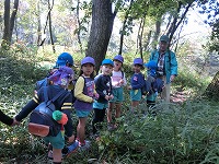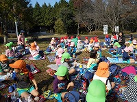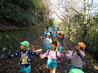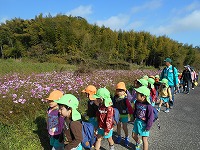 秋の甘南備山遠足に行きました。道中では、柿の木やコスモス畑を見ながら甘南備山保存会の方と楽しく話をして歩きました。途中は、3歳児、4歳児、5歳児とそれぞれの学年に応じて違う道を歩き、散策を楽しみました。おにぎり弁当を食べた後は、鬼ごっこやどんぐり拾い、芝すべりを楽しみ、気持ちの良い秋の1日でした。