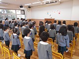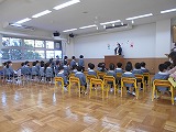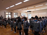 新しくなったホールでの始業式、担任の先生から名前を呼ばれると元気に返事をしてくれた子供たちです。