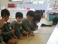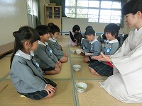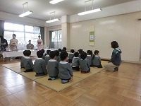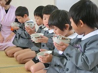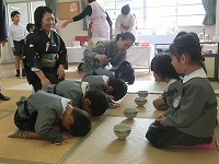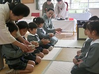 5歳児が幼稚園で2回目のお茶会をしました。少し緊張しながらも前のことを思い出しながらお辞儀や作法などをしていた子どもたちです。お茶会を通して、友達と一緒にお茶会を楽しむこと。人に感謝する気持ちをもつことなど、大切なことを教えていただきました。「お茶おいしいな」「またしたいな」と、楽しみにしています。次回はお家の人をおもてなしする予定です。