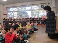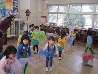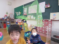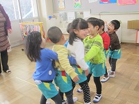 てんぐの鼻の手遊びや、楽しい歌に合わせて友達を豆に見立てて煎って遊ぶ真似をしたりとわらべ歌を楽しみました。