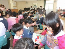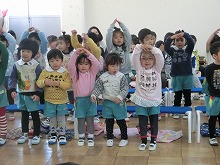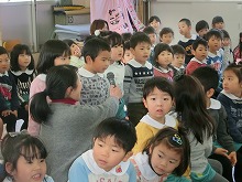4歳児の子ども達が司会をしてくれました。3歳児からのプレゼントにうれしそうな5歳児。仲良しのお兄ちゃんお姉ちゃんにタッチをしました。