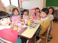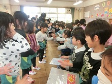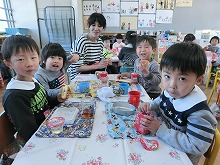 4歳児からも手作りのプレゼントがあり、友達同士「どんなんもらった?」と、見比べながらうれしそうな5歳児です。