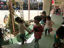 いつも遊んでいた仲良しグループで、サンドイッチの会食をしました。5歳児は、ペアの3歳児の友達を迎えに行き、クラスまで連れていってくれました。