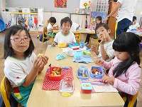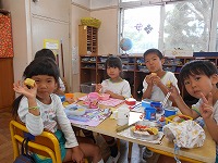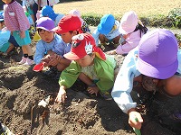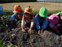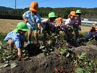6月に挿し苗をし、水やりや草ひきをして育ててきたサツマイモ。26日に収穫をしました。「あったあった」「もっと掘らなあかんな」など、友達と協力しながら掘りました。「焼き芋パーティ楽しみやな」と楽しみにしている子ども達。次の日には、蒸かしいもにしていただきました。