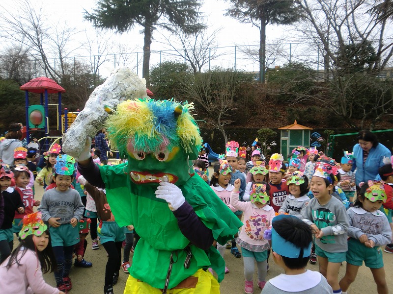 幼稚園にやってきた鬼に「おにはそと!ふくはうち!」と元気いっぱい豆をまいた子ども達。「おなかの中がきれいになったわ」と鬼を退治できて満足そうな子どもたちでした。