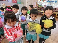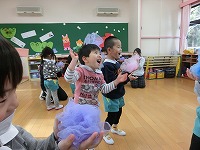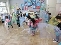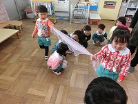 お尻をちょこちょこ動かしおて歩いたり、きれいな布を使ってトンネルにしたり・・・と、3歳児の子どもたちは、心地よい歌に合わせてわらべうたで遊ぶことが大好きです。布をひらひらさせて、雪に見立てたり、小さく丸めて「花が咲いたみたい」と、自由自在になる布で、イメージを膨らませて遊びました。3歳児の子どもたちは、友達と順番を守ってしたり、一緒に動きを合わせて遊んだりすることが楽しくなってきました。次回は、おうちの方との触れ合いのわらべうたも楽しみにしています。