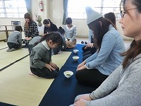 今日は、5歳児の親子でお茶会に参加しました。子どもたちが、今までのお茶会で教わったことを思い出しながら、今日はお母さんにお茶を点てました。お母さんが温かく見守る中、子どもたちは、上手にお菓子やお茶をふるまうことができ、お母さんの「おいしいわ」の声に、こども達も満足そうな顔でした。