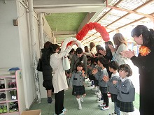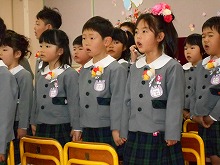 園庭の桜のつぼみがほころび春の訪れを感じられる今日のよき日、第38回修了証書授与式を行いました。お別れの言葉や修了の歌で立派な姿を見せてくれた5歳児。幼稚園で過ごしてきた3年間の中で、自分のしたい遊びをじっくり取り組み、友達と協力する大切さも知ることができました。小学校へいっても、元気いっぱい力を発揮してほしいと思います。いつまでも応援しています。保護者の皆さま、地域の皆さまには温かいご協力、ご支援をいただきましてありがとうございました。