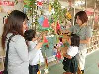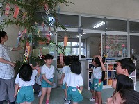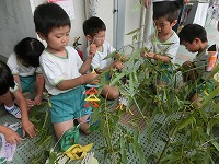 次の日に、3歳児は、親子で願い事を考えて飾り、4,5歳児は友達や先生と一緒にしました。色とりどりの短冊や夏野菜の飾りが風に揺れてきれいです。子どもたちの願いごとが届きますように・・・。