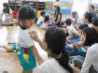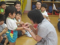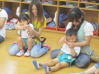 3歳児親子でわらべ歌遊びをしました。お家の方の膝にのせてもらったり、優しく指を数えてもらったり、こそばしてもらったりする子ども達はとてもうれしそうでした。また、お家でも親子のふれあいの時間で遊んでいただけたらと思います。7月も親子でわらべうた遊びをする予定で、季節のわらべ歌もしたいと思います。
