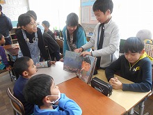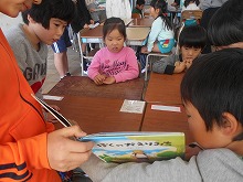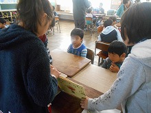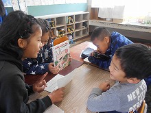 中間休みに5歳児の子ども達が行き、5年生に絵本の読み聞かせをしてもらいました。5年生の皆さんは、幼稚園の子どもたちが喜びそうな絵本やお楽しみを用意して待ってくれていました。教室で、お兄さんお姉さんが読んでくれる絵本を一生懸命聞いている子どもたち。5年生の皆さんには、給食体験でもお世話になり、すっかり親しみをもっています。