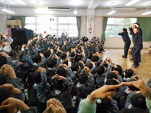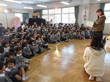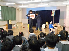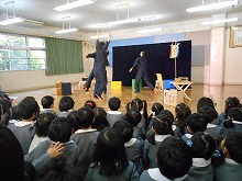 今日は、新年のお楽しみ会がありました。劇団の演劇を見ながら、子ども達はお話に引き込まれ、劇団の人との掛け合いを楽しみました。