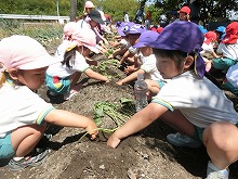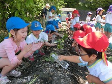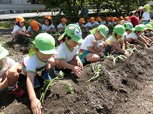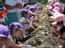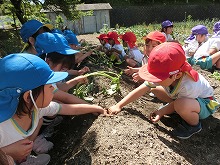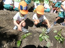 今日は、地域の方にお借りしている畑でさつまいもの苗さしをしました。子ども達は、「さつまいも大好き」「どうやって食べようかな」「前、焼き芋大会したね」と、植える前から楽しみにしながら畑まで歩いていきました。4歳児は自分たちで植え、3,5歳児は一緒に植えました。「優しく土をかけてね」「お水上手にあげられたね」と、5歳児は3歳児に優しく声をかけてあげることができました。土の感触やにおいを肌で感じた子ども達。さつまいもがどのように生長していくのか、水やりや草引きをしながら楽しみに育てていきます。