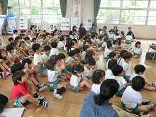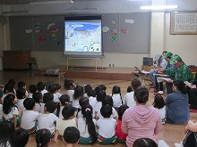 今日は幼稚園に、環境パートナーシップの方に来ていただき、エコ活動や環境のことについて知る「エコフェスタ」がありました。地球温暖化のことや、CO2を減らすにはどうしたらいいかなどの話をスライドを見ながら子どもたちにわかりやすく話をしていただきました。エコに関する○×クイズでは、「テレビのつけっぱなしは×やな」「車ばかり乗らないで歩くのが○やな」とよく考えて楽しみました。