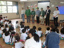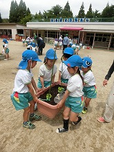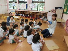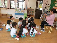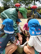 3,4歳児は、クラスで環境についての紙芝居を担任の先生から読んでもらい、5歳児は、環境パートナーシップ、環境課の方と一緒にゴーヤの苗を植えました。「もうゴーヤのにおいがするなぁ」「土をふかふかにかぶせよう」と、大事に植えました。