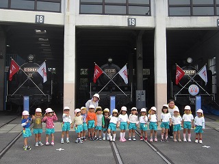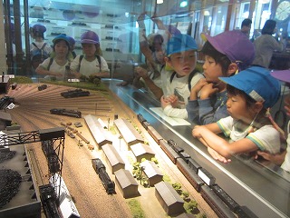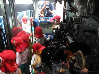 機関車館では、大きな車輪に驚いたり、運転室のところに実際座ってみたり・・・と興味津々の子ども達。