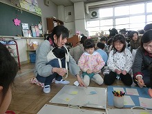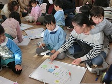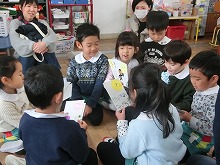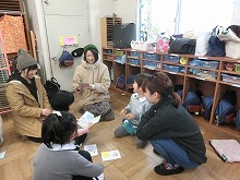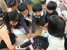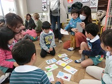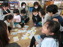 今日は参観日で5歳児は親子でかるた作りをしました。事前に「ひらがなくじ」を子ども達が引いて持ち帰り、お家の方と読み札を考えてきてくれました。子ども達はお母さんとたくさんお話しながら、絵札を描いていきました。「もうすぐ一年生うれしいな!」「右みて左見て、渡ろう横断歩道」など、とってもかわいいオリジナルのかるたが出来上がりました。かるたを囲んでの「かるた大会」は頭をくっつけて、大盛り上がり!「3枚とれた!!」「負けたしめっちゃ悔しい!」などいろいろな思いの見えた楽しいかるた大会でした。読み札を自分で書いたり、かるたの枚数を友達と比べたり、文字や数にも興味をもって楽しめました。残り3か月の園生活となった5歳児のみんなと、たくさんの思い出をこれからも綴っていきたいと思います。参観・懇談会へのご参加ありがとうございました。