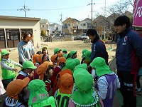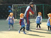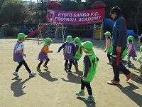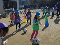 今日は、サンガのコーチが幼稚園にきてくれました。色とりどりのビブスをつけた子ども達は、ボールをドリブルをしたり、キャッチをしたりした後に、サッカーゲームを楽しみました。一生懸命ボールを追いかけ、ゴールにボールが入ると大喜びの子どもたちでした。つながり隊の遊びを通して、話を聞くこと、友達と一緒に協力すること、体をいっぱい動かす楽しさを味わうことなどいろんな学びがありました。これからも、いろんな運動遊びを経験し、元気いっぱい成長していってほしいと思います。