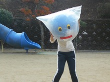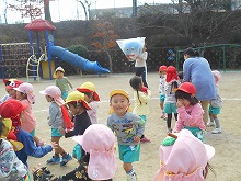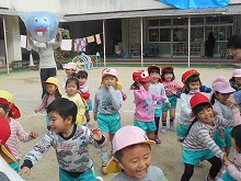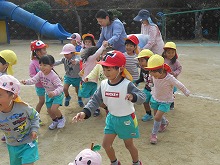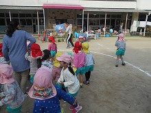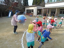 3歳児の子ども達が、転がしドッジボールで遊んでいます。普通のボールではなくて、バランスボールにお化けの顔をつけた「おばけ転がしドッジボール」です。ゴロンゴロンとお化けのボールが転がってくると、子ども達は「お化け来る!!」「わあ逃げろー!!」と、楽しんでいます。友達と一緒にゲーム遊びをすることが楽しい3歳児。サッカーやドッジボールなどいろんなボール遊びに興味をもっています。