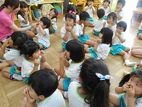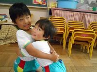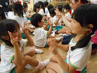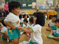 5月は、5歳児が3歳児の着替えの手伝いをしてくれていました。優しく教えてくれる5歳児に親しみを感じ、「お兄ちゃんきてくれた!!」「お姉ちゃん、絵本読んでくれるねん」と、手伝いに来てくれることを楽しみにしていた3歳児です。今日は、仲良くなった5歳児と3歳児が手遊びや、ふれあい遊びを一緒にしました。これからも異年齢のかかわりを大切にしたいと思います。