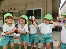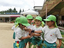 4歳児のクラスの前で育てている夏野菜。毎日水やりをしていた子ども達は「先生こんなに大きくなったよ」「早くとりたい」と、楽しみに収穫しました。つやつやのナスに、いぼいぼのキュウリ。きれいな野菜が採れて嬉しそうな子ども達です。