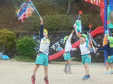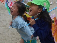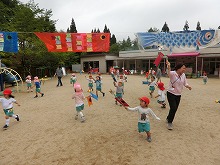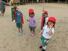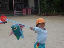 園庭に5歳児がつくったこいのぼりを飾っています。登園しながら「ぼくのつくったこいのぼり!」「これ私の」と、嬉しそうに見上げています。3,4歳児は、矢車のついたこいのぼりをもち、くるくるまわるのが嬉しくてよーいどん!と、園庭を何度も元気いっぱい走りました。こどもの日には、ご家庭でも端午の節句をお祝いされることでしょう。子どもたちは、こいのぼりやかぶとを作ったり、柏餅を友達と会食したことで、日本の行事を知る機会になったと思います。