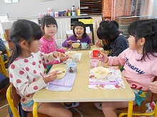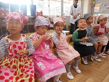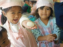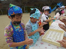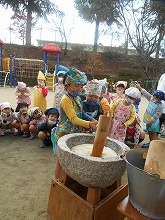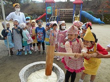 12月になりましたが、今日はぽかぽか陽気の暖かい日になり、もちつき大会をすることができました。前の日には、5歳児がもち米を洗ってお手伝いをしてくれました。蒸しあがったもち米をつく前に少し味見してみると、「おいしい。よーく噛んだらお餅になった。」と、おもちつきに期待が膨らみます。杵をもって「よいしょよいしょ。」と、お餅をついたり、あったかいお餅を丸めたりと、子ども達は昔ながらのもちつきを体験することができました。きなこ餅と雑煮でおかわりもして、おなかいっぱい食べて満足そうな子ども達でした。