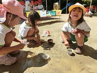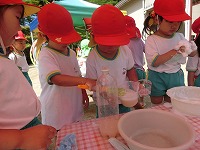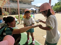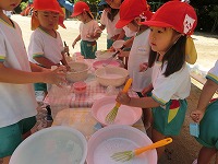 いい天気が続いています。園庭では、水や泡を使ってごちそうにみたてて遊んでいます。「みて!クリームできた」「アイスクリームですよ」「ジュースどうぞ」と、夏のおいしそうなデザートがたくさん出来上がっています。いろんな素材や感触を味わって遊んでいます。
