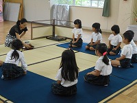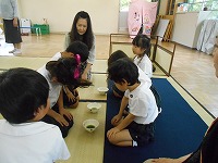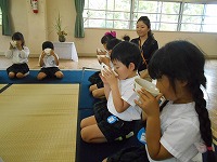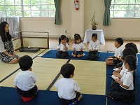 5歳児の子どもたちが、お茶会を体験しました。お茶のお点前を見せていただいた後は、歩き方、お辞儀の仕方、お茶のお運びの仕方など教えていただきました。少し、緊張気味の子どもたちでしたが、お菓子やお茶をいただくとうれしそうな顔でした。秋には、茶筅で自分でお茶を点てる予定です。日本の伝統文化に触れる良い機会になりました。