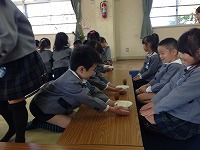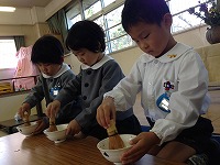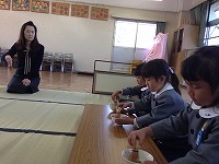 自分でお茶を点てることを体験しました。「茶筅を3本の指でもってね」「1を描くように、縦に茶筅を動かすのよ」と教えていただき、子ども達も真剣に取り組みました。「自分で点てたお茶の味、おいしい!」と満足そうな子ども達でした。