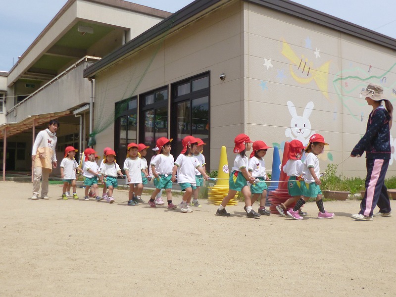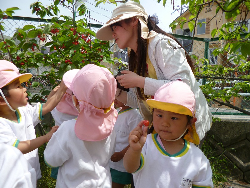 園庭にさくらんぼの実がたくさんなりました。「これ何?」「とってもいい?」と興味津々の子ども達。3歳児の子ども達は、電車ごっこをしてさくらんぼの木までいきました。