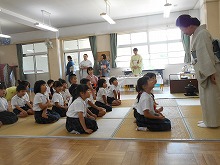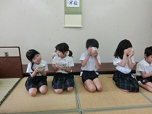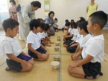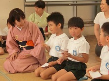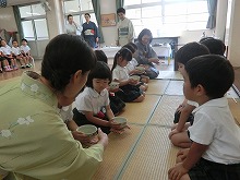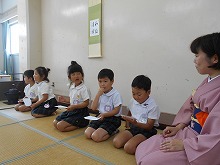お菓子やお茶を頂く時は、「おいしい!」「ちょっと苦いかな・・」と、隣の友達と感想を言い合いながら、和やかな雰囲気でした。掛け軸をみながら、お茶の心「みんなの和を大切にすること」ということも教えていただき、日本の伝統文化に触れる良い機会となりました。お茶の先生方には大変お世話になりありがとうございました。秋と冬にもお茶会の体験があります。とても楽しみにしている子どもたちです。