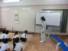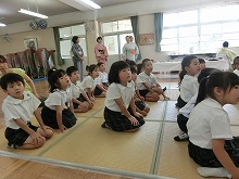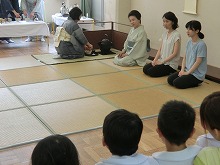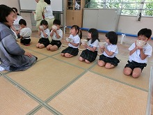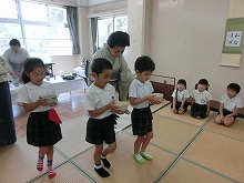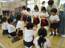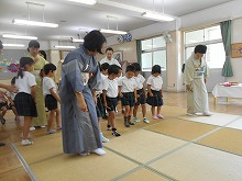 今日は暑い日になりましたが、5歳児はホールで心静かにお茶会に参加しました。初めてのお茶会に最初は少し緊張しながら取り組んでいた子ども達。扇子や袱紗を使う意味や、お茶席の入り方を教えていただきながら、おもてなしをする人と客人を交代してしました。