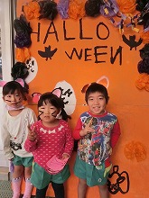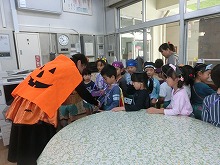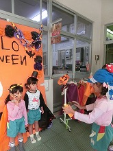 今日は、ハロウィンの日。「トリック・オア・トリート!おかしをくれないと、いたずらしちゃうよ」と、子どもたちが先生の部屋を訪ねてきました。仮装したり、お化けの格好をしたりと子ども達もなりきっています。一人一人お菓子をもらい、ハロウィンの雰囲気を楽しみました。
