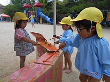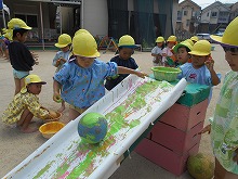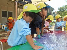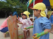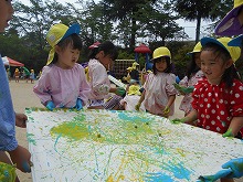 晴天に恵まれて、今日は絵の具遊びを全学年でしました。絵の具で遊ぶいろいろなコーナーがあり、登園してきた子ども達は、どこで遊ぼうかなとワクワクしている様子でした。「ボール転がって道いっぱいできた」「ペンキ屋さんみたい」「ぬりぬりしよう!」と、筆や手も足も使って絵の具の感触を楽しんだ子ども達。最後は、シャワーを浴びてすっきりし「楽しかった」「いっぱい絵の具ついちゃった」と満足そうでした。