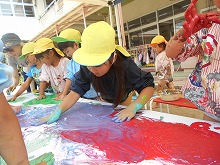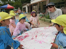 開放的な気分で、友達と一緒に工夫したり自分なりに試したりしながら絵の具の混色の美しさや描かれる模様の楽しさを味わうことができました。友達と一緒に経験した楽しさが、子ども達同士が親しみを感じることにつながっていきます。