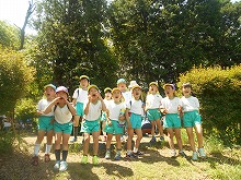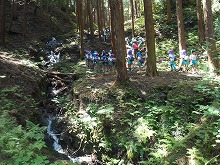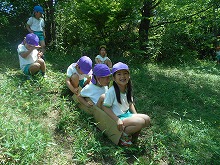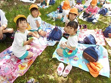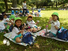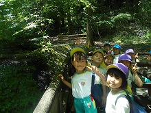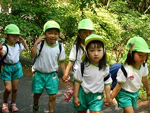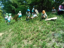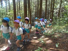 今日は、4,5歳児が甘南備山保存会のおじさんと一緒に甘南備山に遠足に行きました。「今日も元気に歩いて行こう!エイエイエオー」と、元気に掛け声をかけて出発です。山の中は、滝や木陰で涼しく、険しい坂道も「きつい坂やな」「頑張っていこう!」といいながらどんどん登っていくことができました。頂上付近では、「幼稚園見えるかな?」「電車見えたな」「ヤッホー」と、京都市内まで見える明るく広がった景色を楽しみました。一生懸命登った後は、お待ちかねのおにぎり弁当。「何個もってきた?」「おにぎりに何入っていると思う?」など、楽しく話をしながら食べ、芝生広場でも芝滑りをして遊び楽しい日になりました。