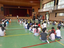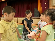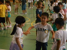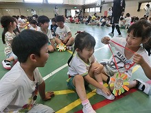 幼小連携の一環で5歳児と薪小学校の一年生との交流が小学校の体育館でありました。初めての交流を楽しみにしていた5歳児。自己紹介をしたり、素敵なペンダントのプレゼントをもらってうれしそうな子ども達です。一年生が優しくリードしてくれてフォークダンスも楽しみました。「今日はありがとうございました。また一緒に遊ぼうね」と、5歳児はお礼の手紙を渡しました。これからいろんな学年の小学生とのふれあいや交流を楽しみにしています。