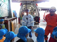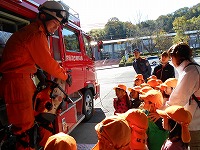 4歳児は、ミニ消防車に乗せてもらい嬉しそうな顔。その後、救急車、消防車、レスキュー車などいろんな種類の緊急車両の説明を聞いたり、実際に機材を触らせてもらったりしました。色々な機材に興味津々で、「それは何?」と質問する姿もみられました。