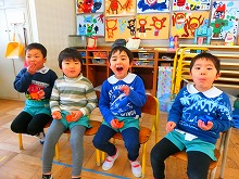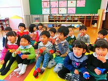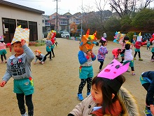 2月3日は節分。一足早く豆まきをしました。園庭で手作りのお面を被り座って節分の話を聞いていると・・・。「わー鬼がきたー」と、突然現れた鬼に、びっくりした子どもたち。勇敢に「おにはそと!」と、豆を投げている子や先生のそばで鬼を見ている子などがいましたが、みんなで元気いっぱい「鬼は外!福は内!」と豆まきをし、体がぽかぽかになりました。そのあとは、自分でつくった三方に年の数の豆をいれてもらい、「かんだら黄な粉の味がするな」と味わって食べる子どもたちでした。気持ちも新たに春を迎え、今年も元気な1年が過ごせますように・・・。