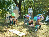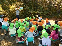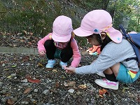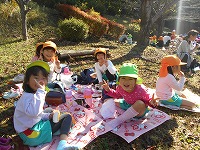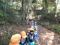 今日は、全学年で甘南備山に遠足に行きました。3歳児は初めての甘南備山登山です。山の中は、松ぼっくりやドングリでいっぱい。「ここにもあった」「こんなんみつけた」と、お土産をたくさん見つけながら歩きました。4歳児は、薪にまつわる昔話の紙芝居を途中で見ました。学年に分かれて、山を歩きましたが、お弁当はみんな揃って芝生広場で食べ、その後元気に鬼ごっこや芝滑りをして遊びました。天気にも恵まれ、秋の気持ち良い1日になりました。